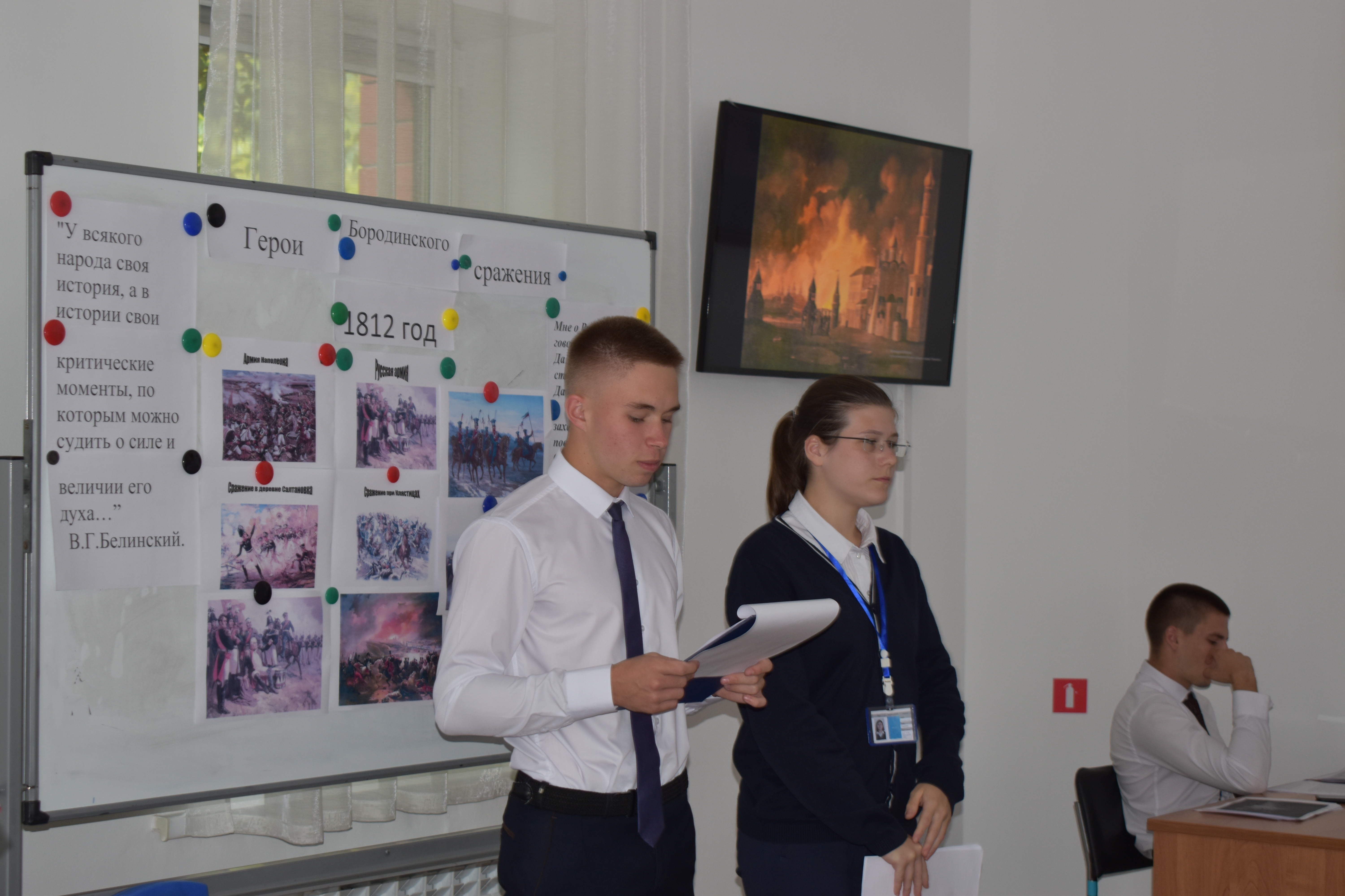 Карпелянская Римма Борисовна вместе с учащимися 11 класса рассказали о ходе битвы и героях тех исторических событий: М.И. Кутузове, П.И Багратионе, Н.Н. Раевском, Д.В. Давыдове и т.д. Эти имена вошли в историю российской армии, но также в боях отдавали свои жизни и обычные солдаты, без высокого чина и звания. Они были способны встать стеной, защищая Родину, поэтому мы обязаны помнить их подвиги, совершенные во благо Отечества.
