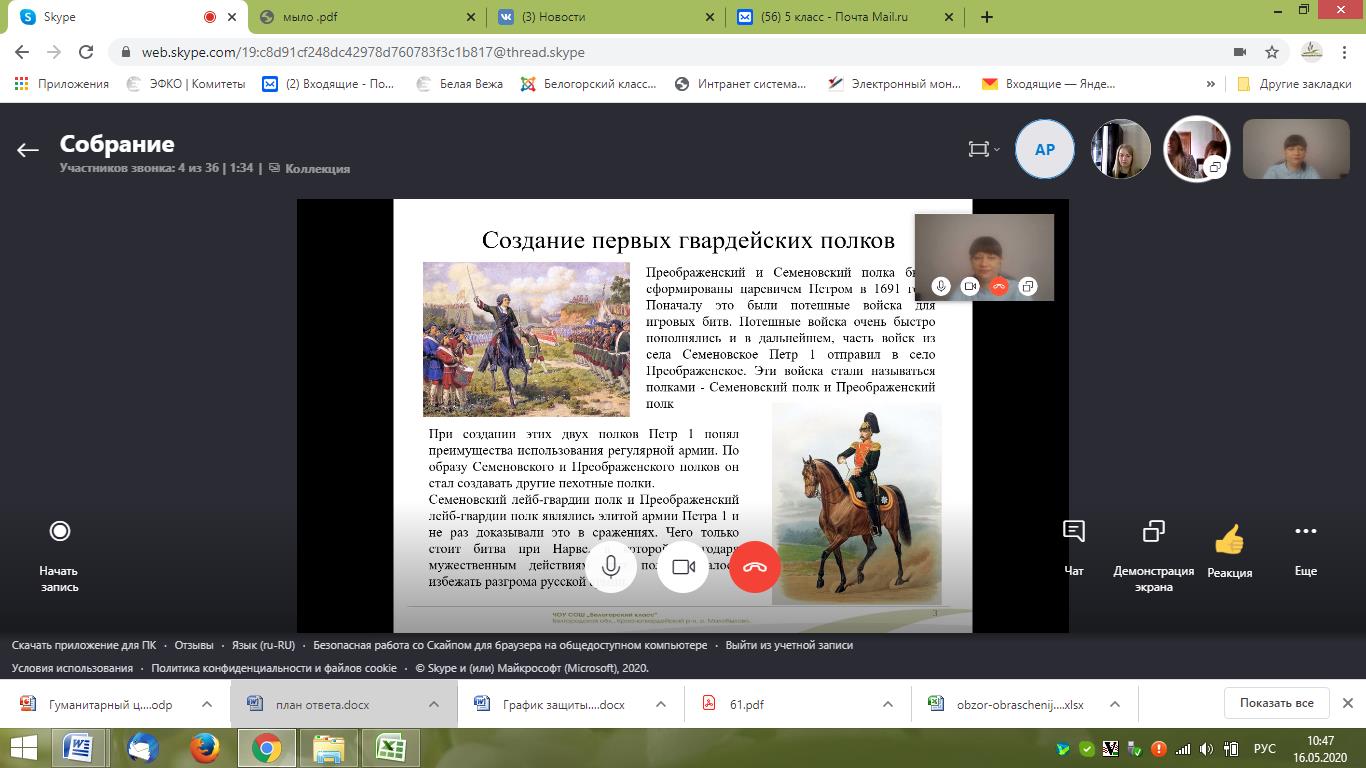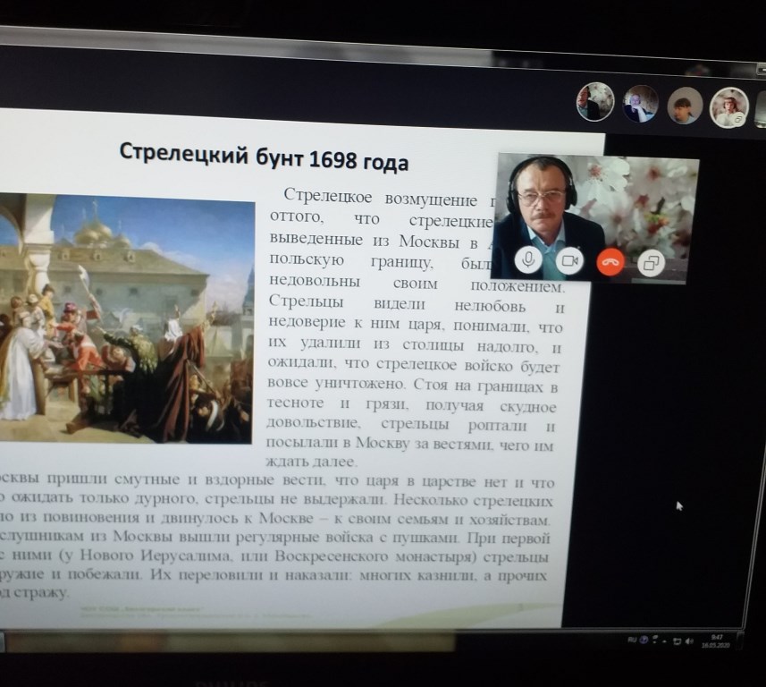 В назначенное время учащиеся совместно с родителями выходили на связь и вели трансляцию из дома. Членам комиссии пришлось провести не один час перед экранами мониторов, но это того стоили. Все по-разному подошли к подаче своего материала, к оформлению презентаций. Было рассказано о детских и юношеских годах Петра Великого, об его приходе к власти, семейной жизни и, конечно же, о военных победах и неудачах, о строительстве Санкт-Петербурга.