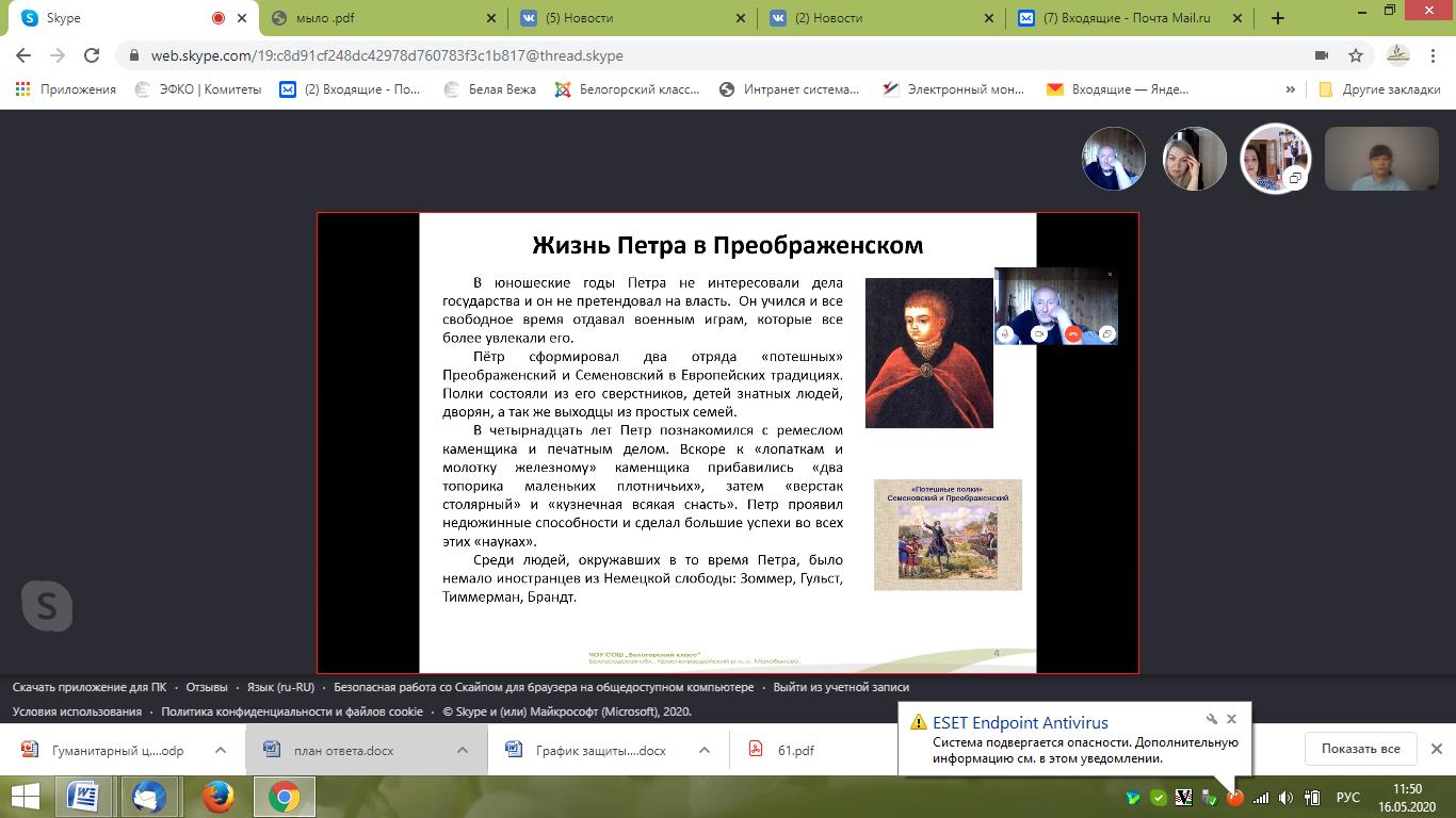 В мае 2020 учебного года в онлайн-режиме в «Белогорском классе» прошла защита проектов в рамках Гуманитарного цикла по темам, связанным с личностью и методами правления императора всероссийского Петра Первого.