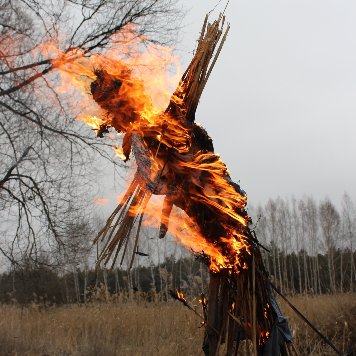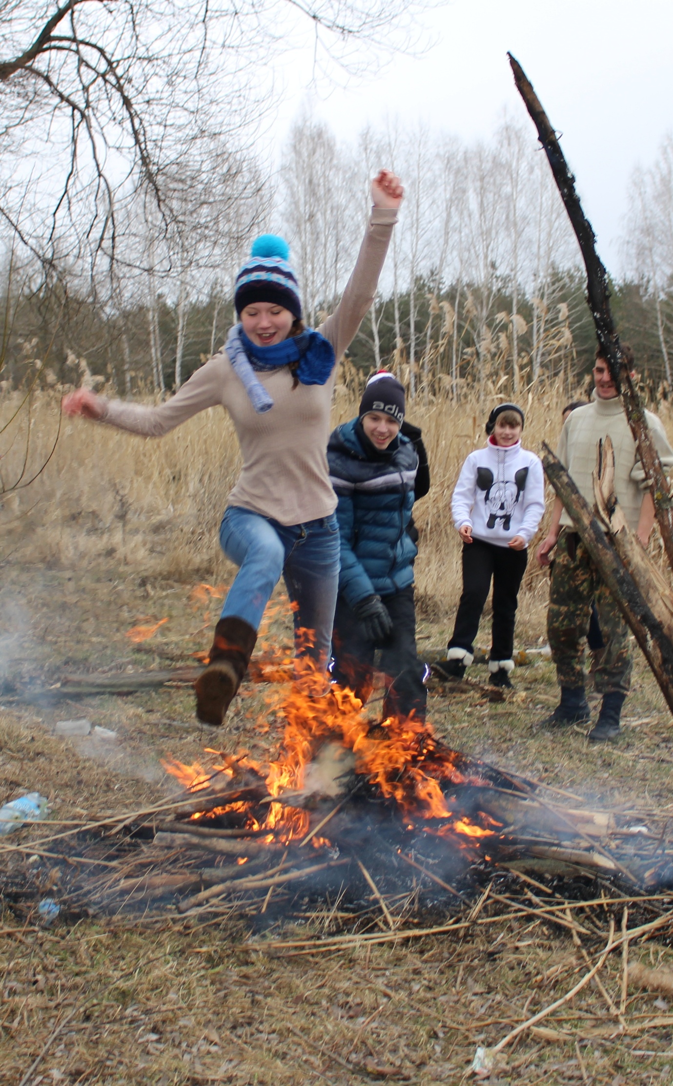 Подкрепившись блинами, решили покончить с зимним настроением и сжечь чучело Зимы. Зима не сопротивлялась и горела, как олимпийский огонь. Под восторженные крики было принято решение прыгать через костер, чтобы зарядиться его теплотой на будущее, ведь считается, что костер на Масленицу обладает особой силой.