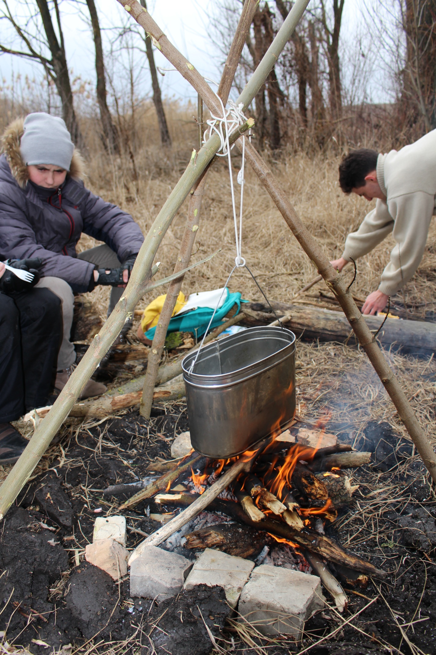 Через час здесь был развернут туристический лагерь с палаткой, скамейками и, конечно, ярким костром, над которым уже закипала вода в котелке.