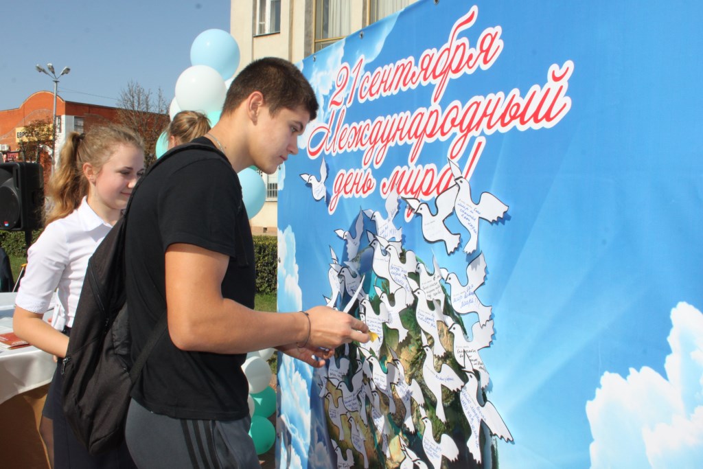 Ребята поздравляли прохожих с праздником и предлагали поучаствовать в акции. Все знают, что символом мира является голубь, держащий в клюве оливковую ветвь. Именно поэтому участникам акции раздавали изображение белого голубя, на котором было написано: «Я хочу, чтобы…». Нужно было дописать пожелание и приклеить на модель планеты Земля. Учащиеся активно работали, привлекали внимание прохожих. Для них было важно, чтобы люди высказали своё мнение, задумались о чистом небе над головой и просто порадовались этому празднику. Атмосфера была очень доброжелательной, поэтому мы, участники акции, поняли одну очень важную вещь: надо верить, что руководители всех стран прекратят гонку вооружений, остановят кровопролитие в мире. Ведь столько людей этого хотят! Мы не видели войны, но знаем, что у неё страшное лицо. Мы за мир во всём мире!