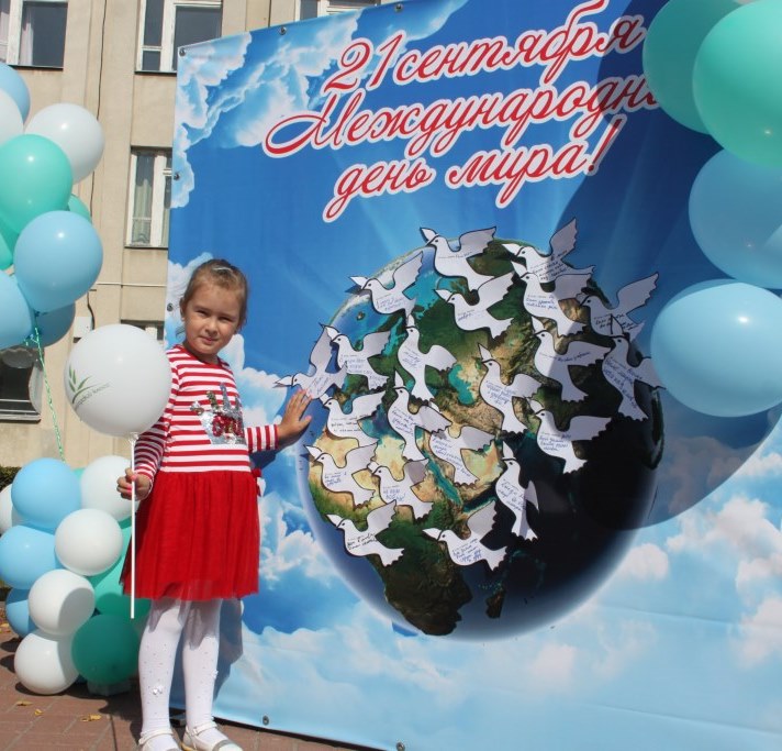 Тянущиеся к чистому осеннему небу белые шары, большой баннер с изображением Земли, умиротворенная музыка, дающая надежду и веру в лучшее, и голоса детей - всё это способствовало тому, чтобы можно было задуматься о людях, живущих на территориях, где ведутся военные действия, мечтающих о прекращении войны и наступлении мира.