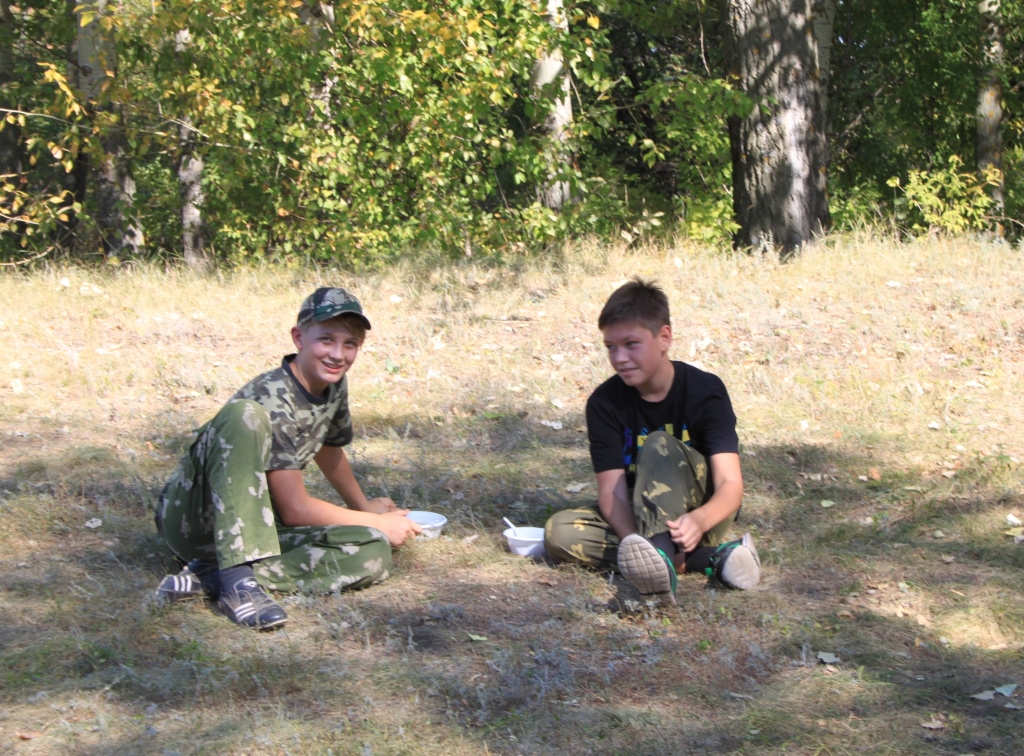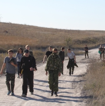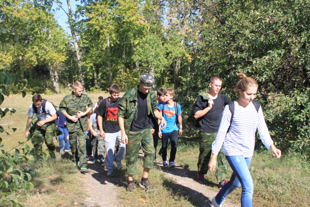 Построив всех колонной, назначив впереди идущих и замыкающих строй, учитель физической культуры и одновременно главный наш идейный вдохновитель Малюков Константин Анатольевич дал команду начинать движение. Дорога оказалась долгая, но идти было весело! Конечно, не все привыкли к таким расстояниям, некоторым пришлось собрать всю свою волю в кулак, чтобы не сбиться с темпа, заданного нашим руководителем. Успевали, однако, и петь песни, и рассказывать анекдоты, и любоваться прекрасными осенними пейзажами, которые, кажется, точь-в-точь повторяли картины Левитана, Шишкина. Все это успевала запечатлевать «для потомков» наш бессменный фотокорреспондент Босько Елена Николаевна. И вот спустя полтора часа мы достигли своей цели! Недалеко от стелы, прямо через дорогу, находилась небольшая полянка, где нас уже дожидались учителя, добравшиеся первыми. Они разожгли костер, сварили полевую кашу, испекли картошку. После такого марш-броска это было как раз то, что надо!