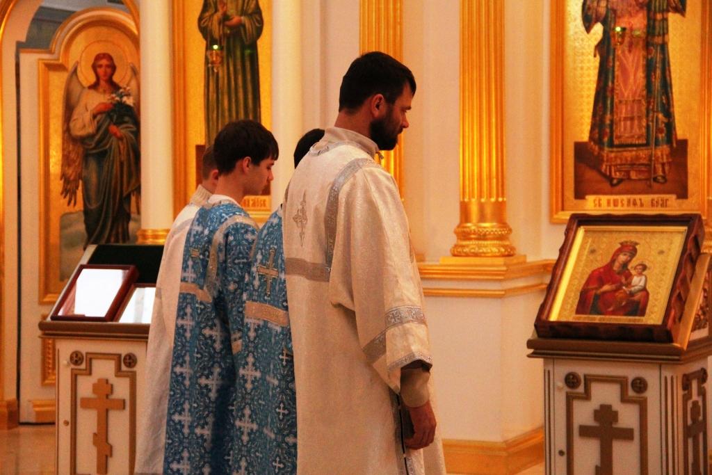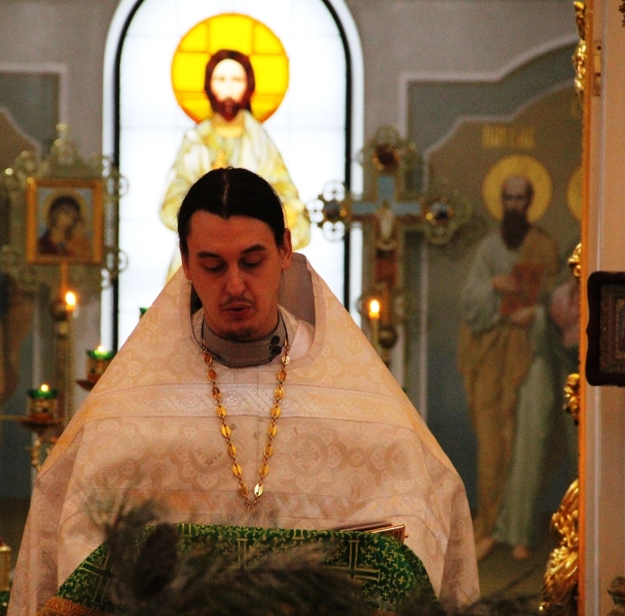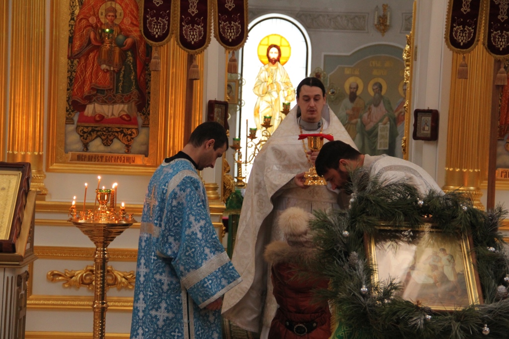 Священник о. Александр в праздничной ризе читал Святое Евангелие, тропари, молитвы, установленные для Рождественского чина (порядка). Ему вторили прекрасные голоса певчих. В центре храма, на аналой (подставка для иконы) была возложен образ Богоматери с Младенцем на руках. Многие подходили к этой иконе, совершали крестное знамение, преклоняли голову и целовали этот святой образ.