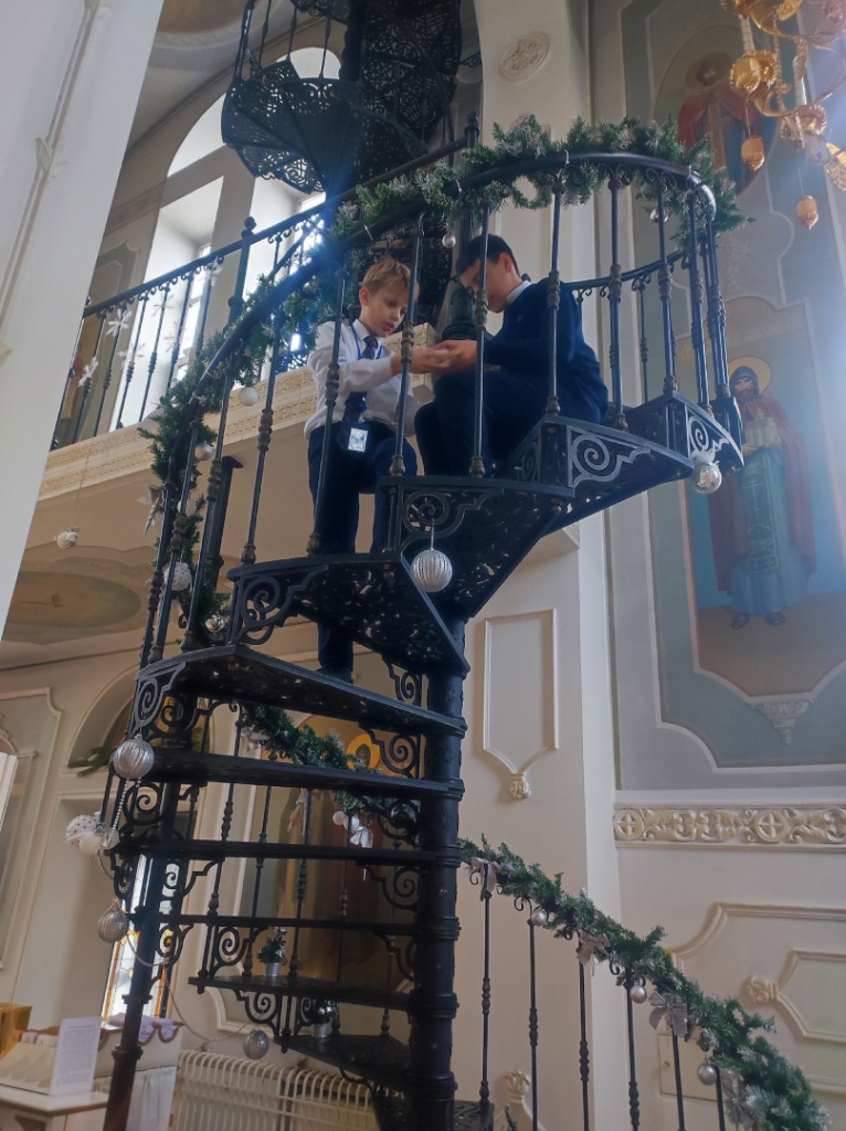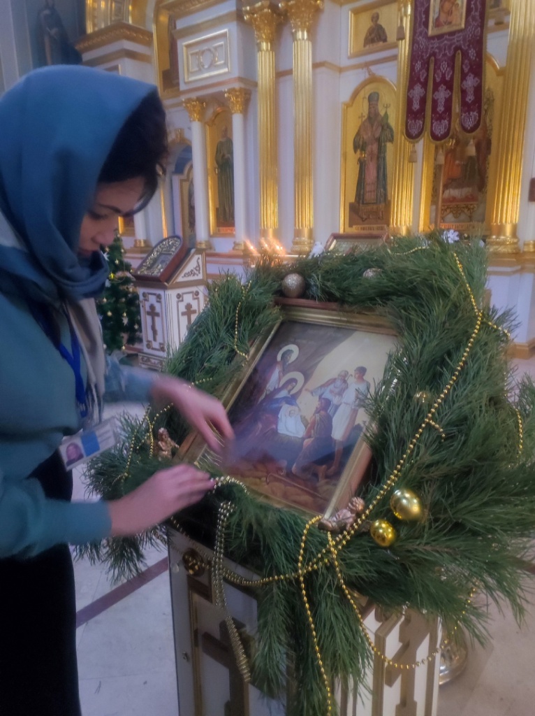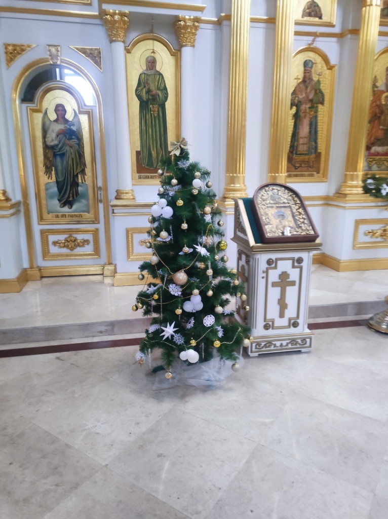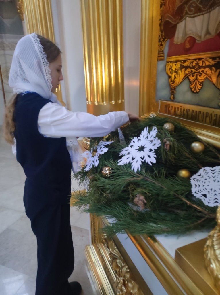 Рождество Христово — один из основных христианских праздников, посвященный появлению на свет младенца Иисуса Христа. В преддверии этого дня, в конце первой четверти, учащиеся 5-6 классов украсили храм Сергия Радонежского. Были установлены ёлочки, и на них ребята разместили шары, снежинки, бусы и ангелочков, сделанных своими руками; преобразилась лестница и, конечно же, в центре зала своё почётное место заняла главная икона, знаменующая рождение Иисуса Христа.