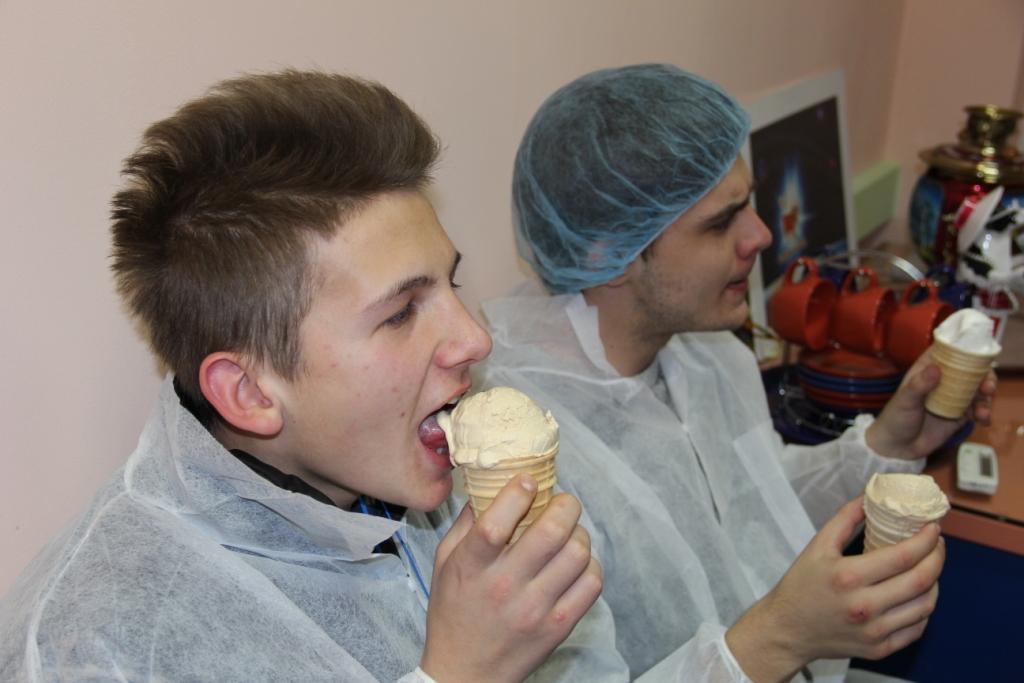 Во время экскурсии всем желающим разрешили попробовать самим сделать мороженое. На первый взгляд, это элементарная задача: нужно просто подставить вафельный стаканчик под кран, откуда непрерывно струей поступает пломбир. Но, как сказали сами ребята, решившие попробовать, не так это и просто! Нужно вовремя успеть убрать стаканчик, когда он наполнится, если только вы не хотите, чтобы сладкая масса осталась у вас на рукаве.