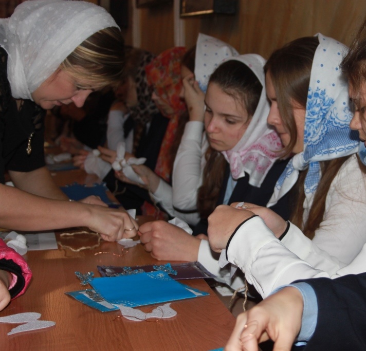 Закончилась встреча с воспитанниками Воскресной школы исполнением рождественских песен, колядок. Во время чаепития мы подарили на память нашим новым друзьям открытки, изготовленные собственноручно.