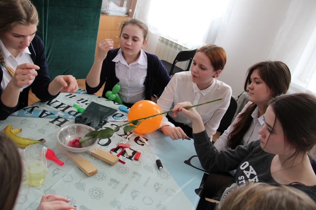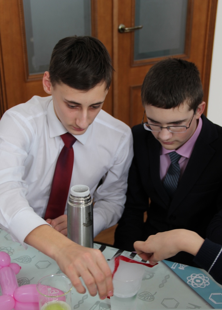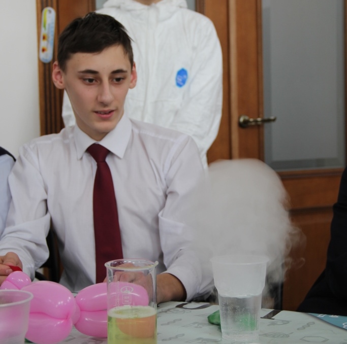 Большой интерес вызвал опыт с мыльными пузырями, которые нужно было надуть с помощью азота. В сосуд с водой мы налили жидкий азот, смочив предварительно шнурок в «Fairy», затем быстро провели натянутым шнуром по всему сосуду - и начал выдуваться большой мыльный пузырь! Это произошло из-за испарения азота и его увеличения в объеме. Но не только перечисленные эксперименты проводились у нас на занятии: ещё мы надували шарик азотом, когда же выливали на него жидкий азот, он сжимался, а по мере нагревания обратно принимал свою форму.
