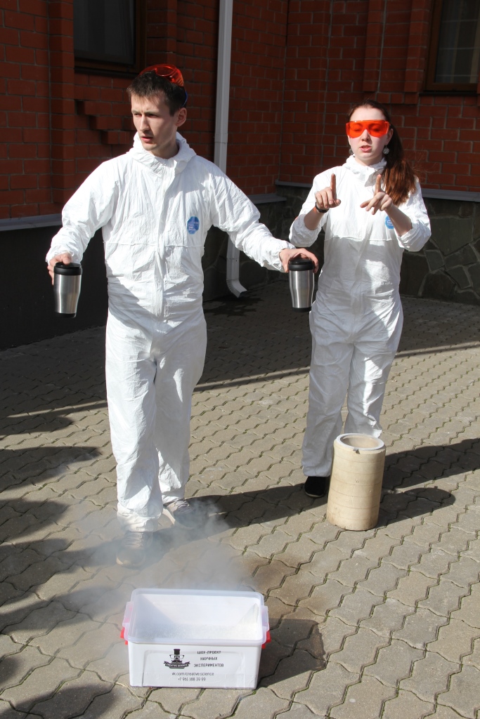 В качестве новой темы для встречи была избрана занимательная физика, работа с низкими температурами. В этот раз мы ставили опыты с жидким азотом (его температура – 196 градусов). После рассказа об условиях его хранения, способах транспортировки нам стало понятно, что иметь дело с жидким азотом очень опасно: при нагревании он увеличивается в 700 раз! Интересно было узнать также, что если в азот ненадолго погрузить предмет, то с ним ничего не произойдет, но если подержать в азоте что-нибудь подольше, то оно тотчас замерзнет и станет хрупким. Мы пробовали заморозить банан и розу, что у нас отлично получилось: после заморозки разбили банан молотком, а розу - о каску, надетую на голову одного из учеников.