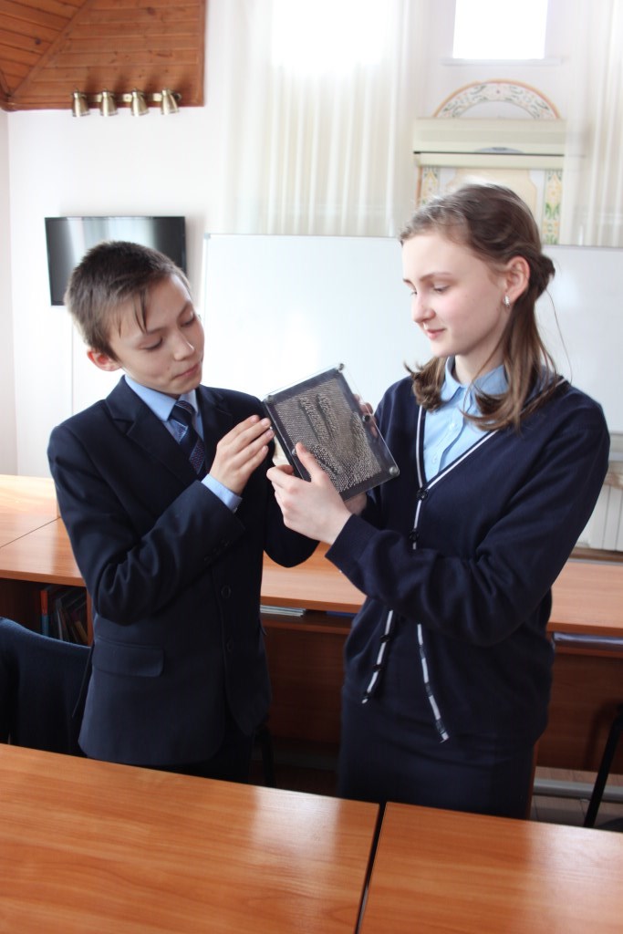 Самым последним выступил Рыжих Владислав, рассказавший об удивительном изобретении Александра Алексеева – об игольчатом экране, предназначенном для воспроизведения изображений. С помощью миллиона иголок и вертикальной доски Алексеев создал приспособление, позволяющее демонстрировать шедевры черно-белой анимации. Изобретение ученого по праву считается одним из самых необычных. Затем Владислав показал нам этот прибор, и мы сами пробовали смоделировать отпечатки наших ладоней, мяч и ложку. Было очень интересно! А ещё Владик посоветовал нам посмотреть мультфильмы «Пейзаж мысли», «Отпечатки», «Урок охоты», созданные при помощи именно этой технологии.