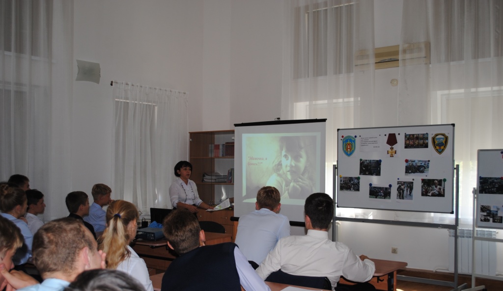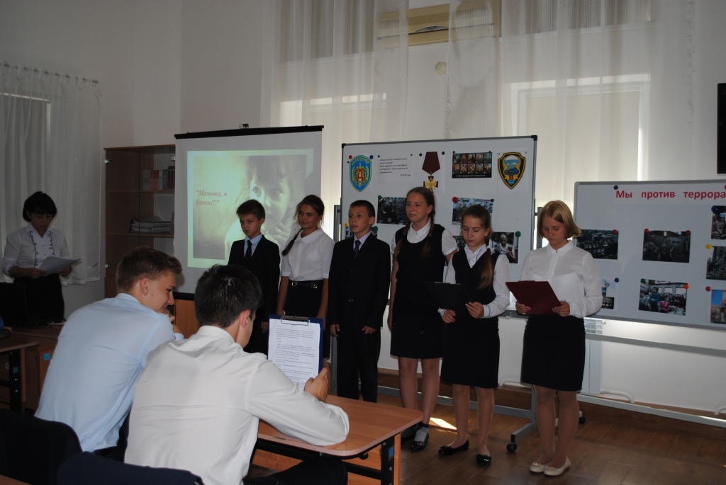 Ребята 6 класса начали его словами стихотворения Ольги Богомоловой «Кусочек неба в маминой ладошке». Проникновенные слова этого произведения о детях, которые погибли во время террористического акта 2004 года в Беслане, настроили всех ребят на участие в серьезной беседе.