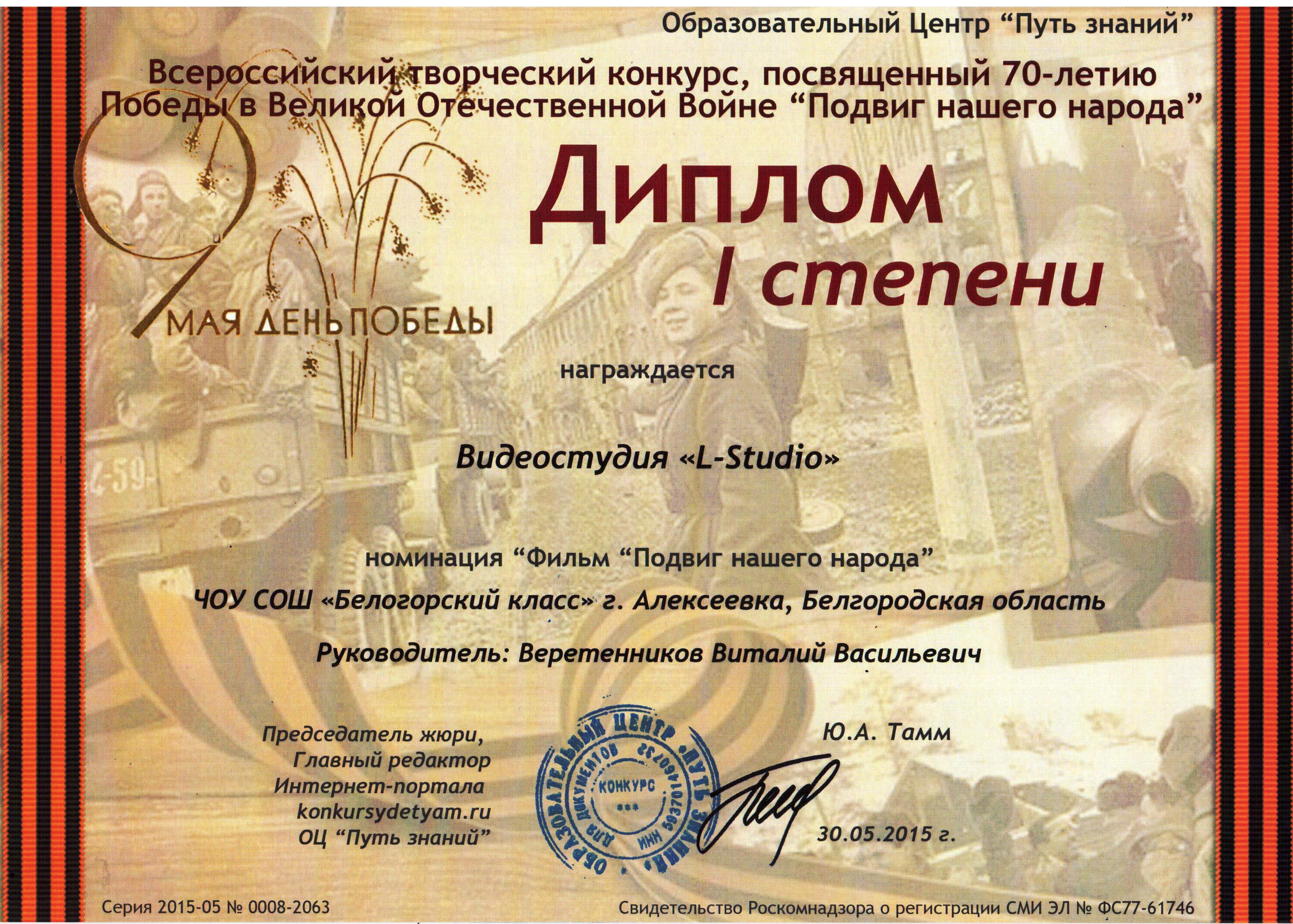 Диплом I степени Всероссийский творческий конкурс, посвященный 70-летию Победы в Великой Отечественной Войне "Подвиг ...
