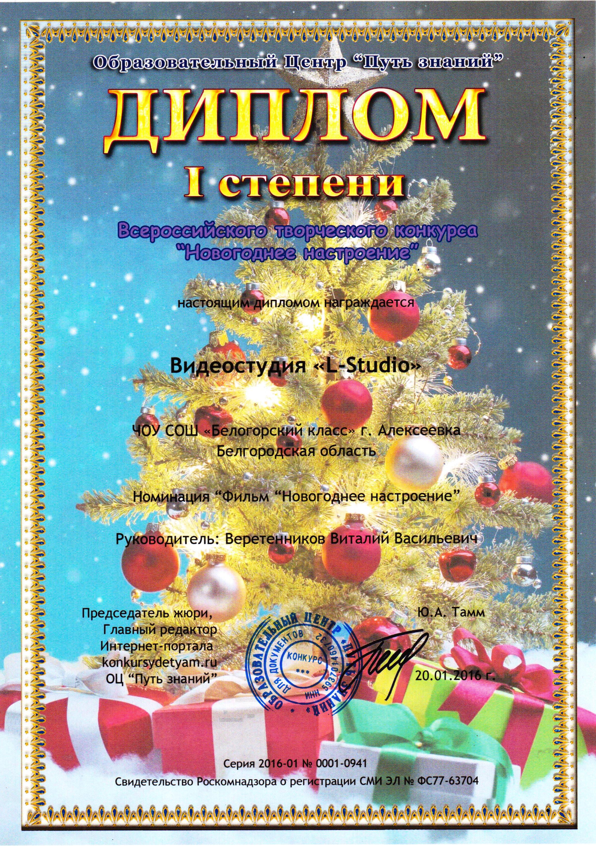 Диплом I степени Всероссийского творческого конкурса "Новогоднее настроение". Номинация "Фильм "Новогоднее настроение...