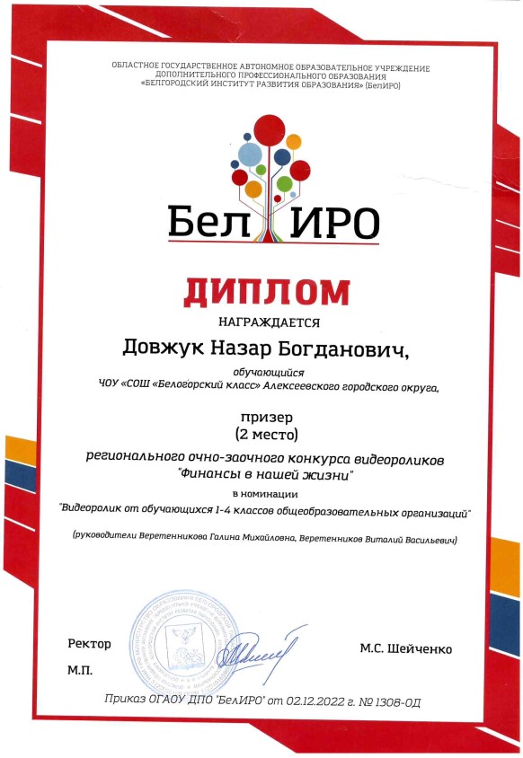 2 место регионального очно-заочного конкурса видеороликов "Финансы в нашей жизни" в номинации "Видеоролик от обучающ...