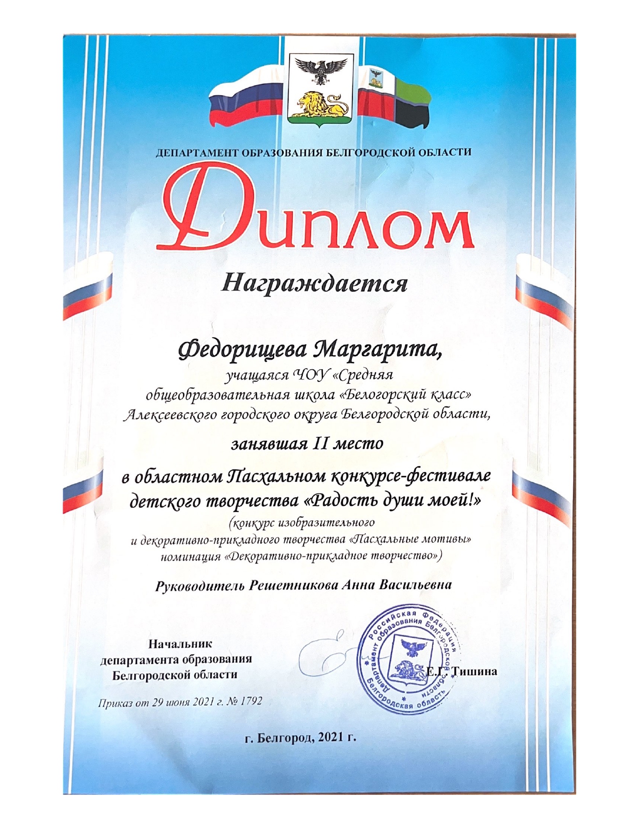II место в областном Пасхальном конкурсе-фестивале детского творчества "Радость души моей!" Руководитель: Решетникова А...