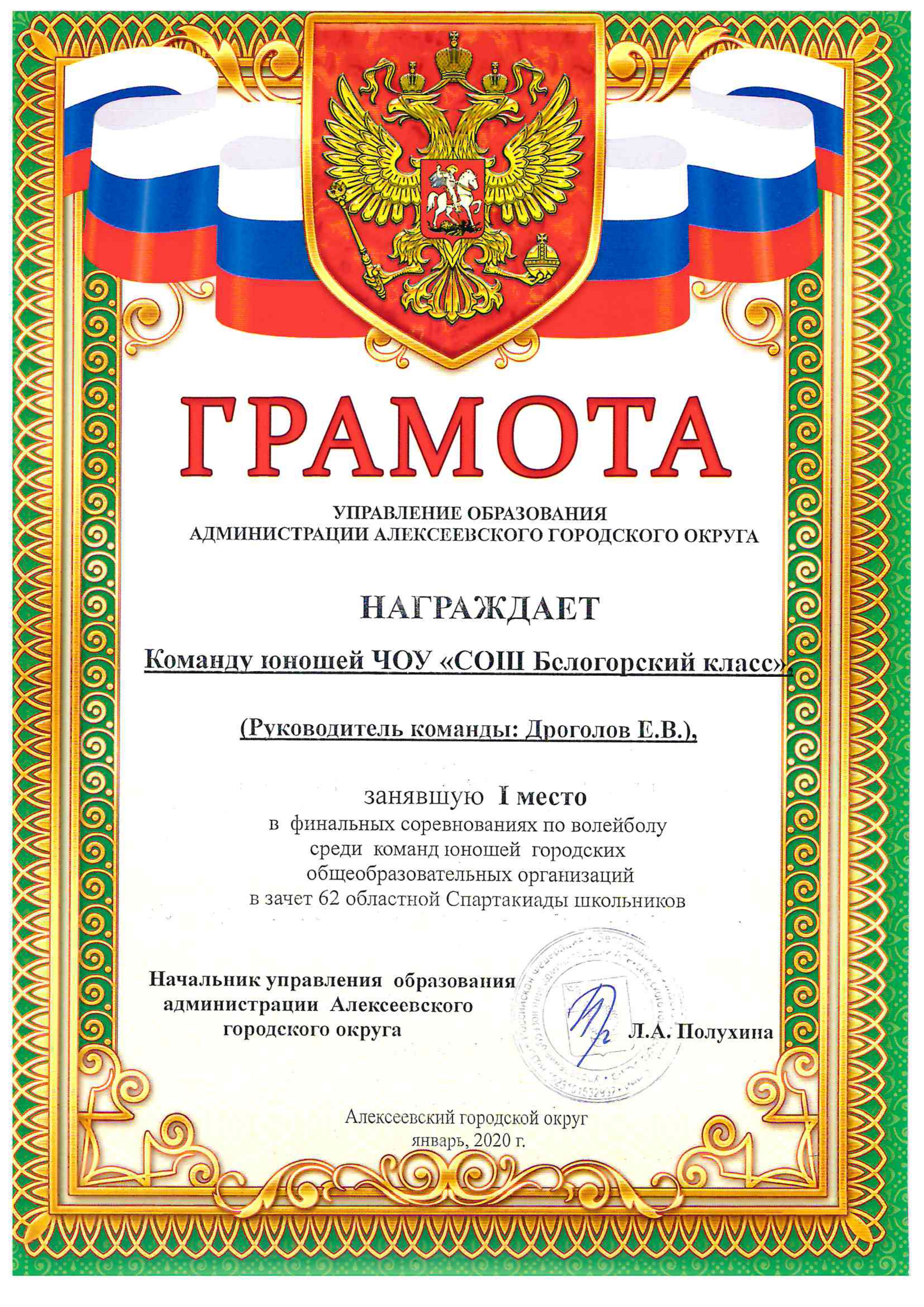 I место в городских соревнованиях по волейболу среди юношей Руководитель: Дроголов Е.В. Алексеевка, январь 2...