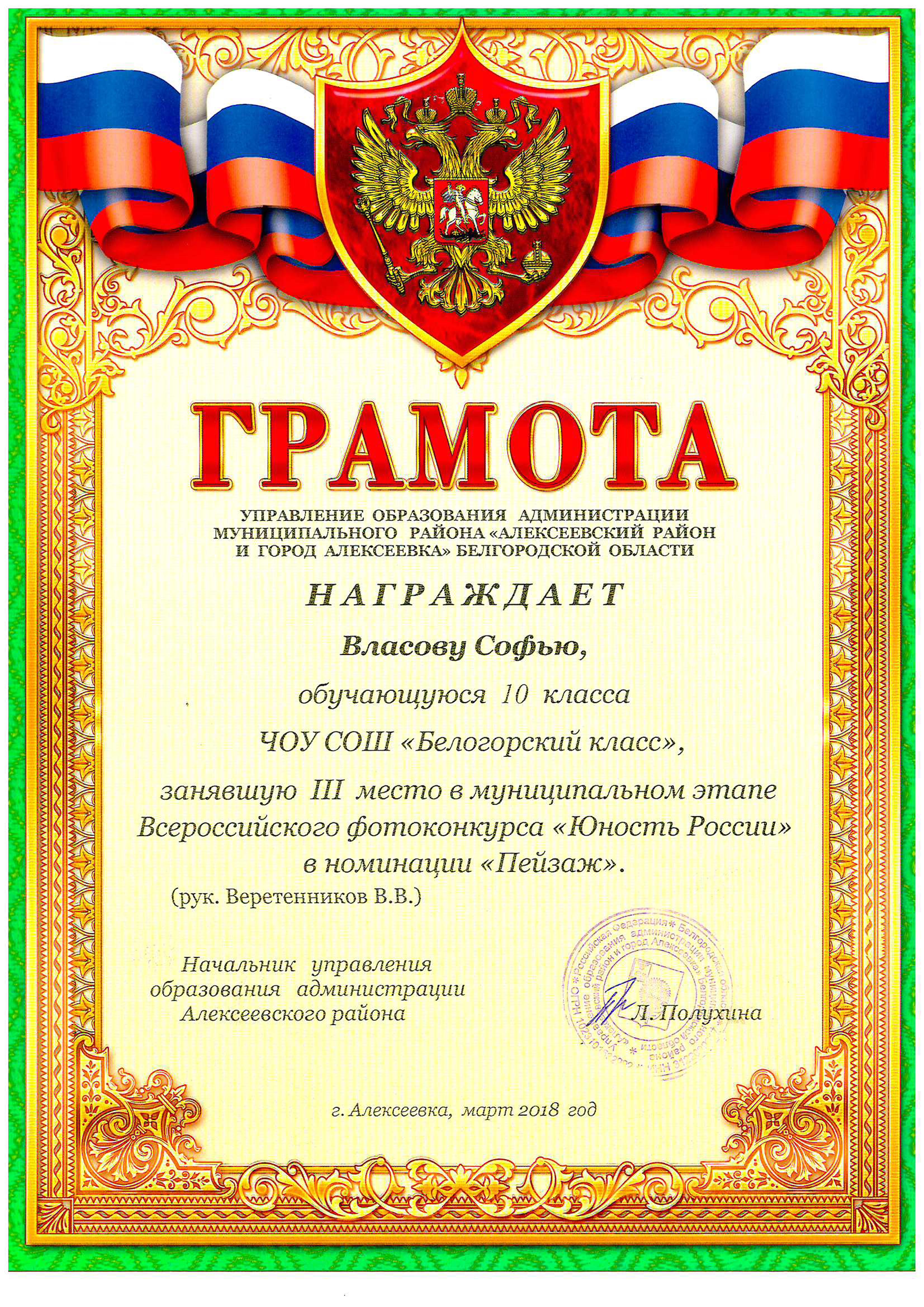 III место в муниципальном этапе Всероссийского фотоконкурса "Юность России" в номинации "Пейзаж" Руководитель: Веретен...